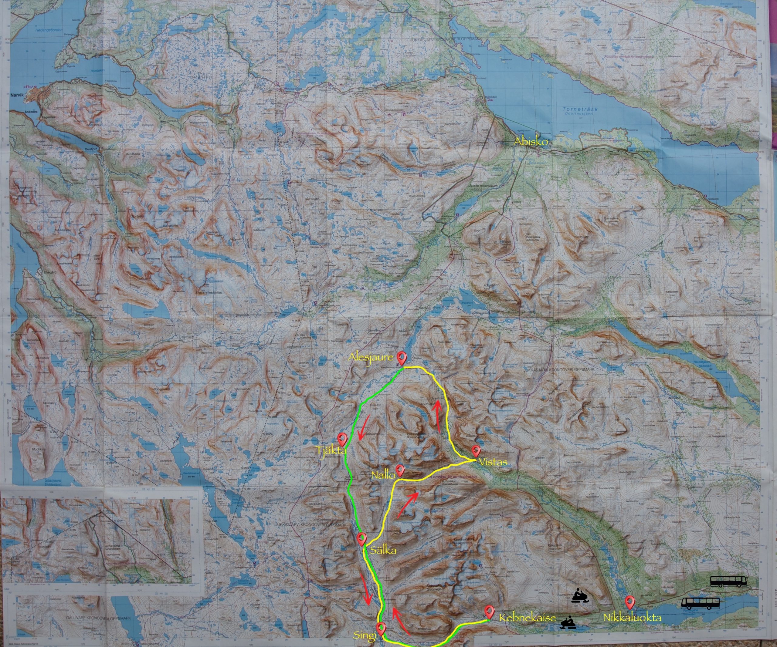 Cette année, nous démarrerons notre marche au sud, à la station de montagne de Kebnekaise. Côté logistique, nous passerons une nuit à la descente de l’avion, à Kiruna. Puis nous prendrons un bus qui nous acheminera au village Same de Nikkaluokta. Et enfin, un taxi motoneige (oui oui !) nous emmènera à Kebnekaise Fjällstation. Puis le lendemain, nous pourrons nous lancer sur la piste de la Kungsleden. L’idée est de faire une boucle en empruntant des vallées que je n’ai jamais pratiquées en hiver : celle de Sälka à Vista via Nallo et la seconde de Vistas à Alesjaure. Nous ferons le retour vers le sud, sur le parcours classique.